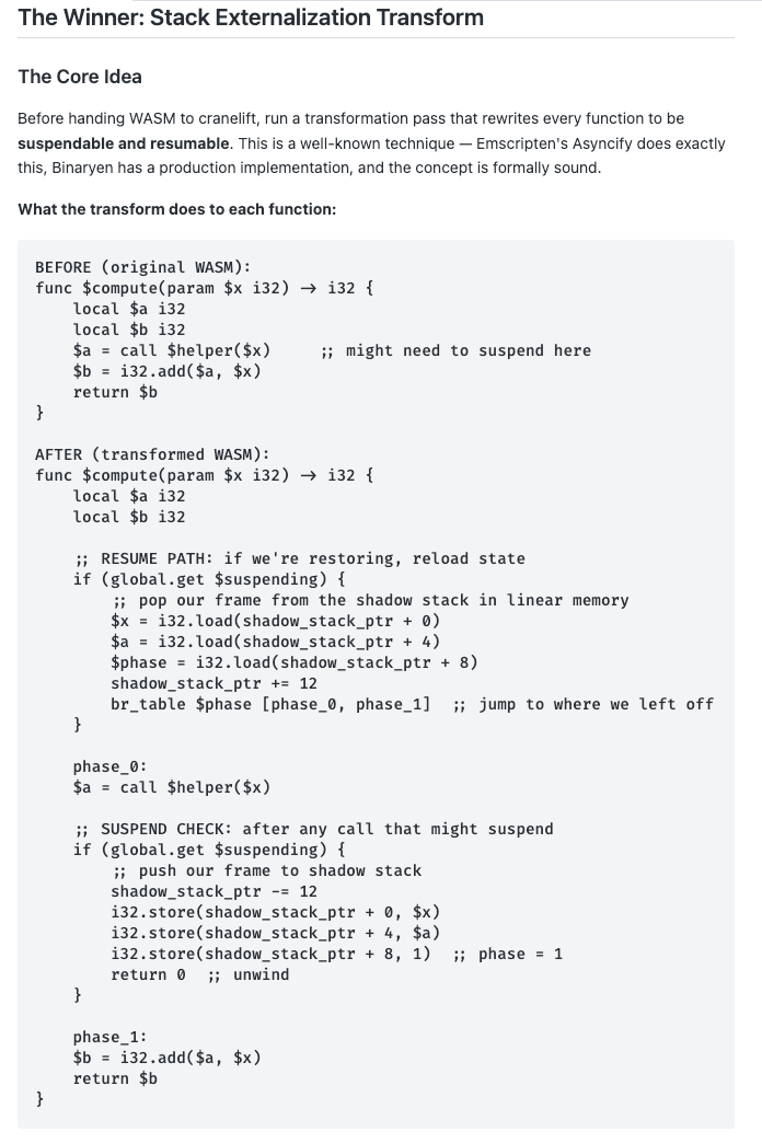 At a high level, the mechanism works by interrupting execution, advancing to a deterministic safepoint (between Wasm instructions), and then performing live analysis (precomputed during compilation) to identify which registers hold stack-relevant values. These are then pushed onto the stack of a universal, portable VM representation of the program state — producing a serializable snapshot.