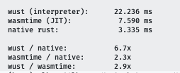 The native rust approach is comparing a bit of an unfair apples and oranges approach because the release version for it compiles the function into a tail call optimization afaik - whereas my WASM module uses recursive function calls)