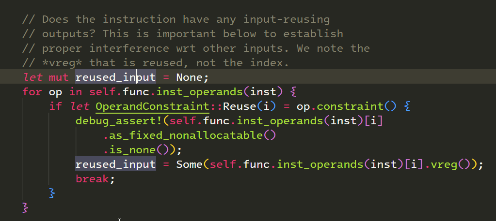 To the first: But with the constraints I've given it, it is forced to put the flags where I've specified. It cannot put edits into the middle(before the early and late) stages of my instruction. It must satisfy the constraints coming in, that the in_cf(or a copy of it) be in PREG_CF, and that PREG_CF will be something different on the way out. If the value of in_cf lives past this SBB instruction, shouldn't regalloc2 be aware that it cannot store it in a PREG and force a spill of the value, meaning it exists in both a stack slot and PREG_CF going in to the SBB? But really, in_cf is dead after the instruction, so to me it isn't clear why it cannot be allocated for both in_cf and [out_]cf.