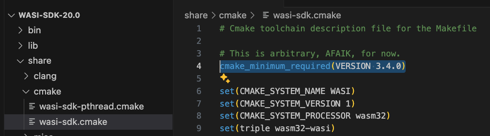 I initially thought a CMake error I encountered was caused by wasi-sdk, so I opened an issue there "Compatibility with CMake < 3.5 has been removed from CMake.".